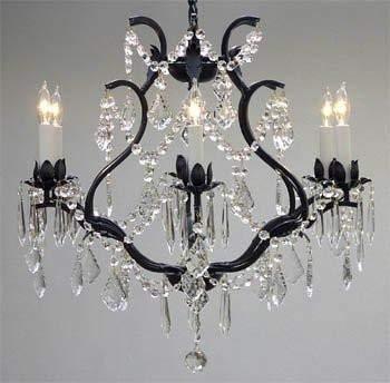 This beautiful Chandelier is trimmed with Empress Crystal(TM) A Great European Tradition. Nothing is quite as elegant as the fine crystal chandeliers that gave sparkle to brilliant evenings at palaces and manor houses across Europe. This beautifully unique version from the Maria Theresa Collection has 100% Crystals that capture and brilliantly reflect the light of the candle bulbs which sit in a leaf design bobache. The frame is all hand-forged wrought iron, adding the finishing touch to a wonderful fixture. The timeless elegance of this chandelier is sure to lend a special atmosphere anywhere its placed! SIZE: H.19" W.20" 6 LIGHTS. Assembly Required.