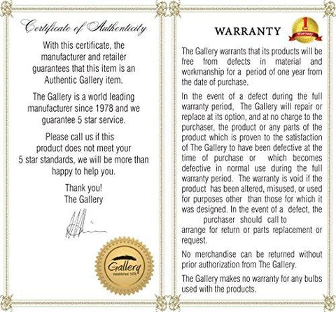 1. Each item comes with a Certificate of Authenticity, certifying this product is an authentic Gallery lighting fixture.