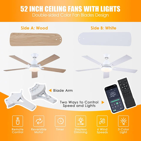 Ceiling Fans with Lights, 52inch Low Profile Ceiling Fan with Light and Remote Control,Reversible, 3CCT, Dimmable, Quiet, White Ceiling Fan for Bedroom Indoor/Outdoor Use