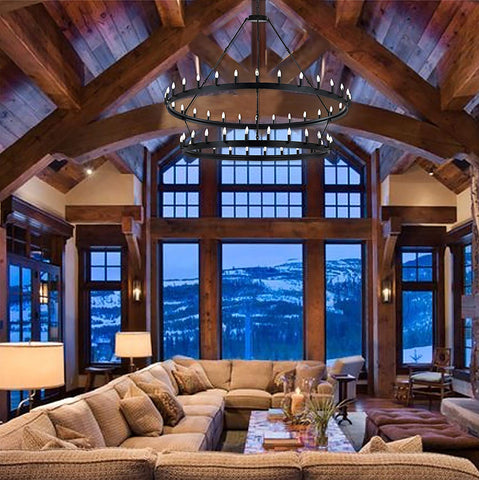 Set of 2 - Wrought Iron Vintage Barn Metal Castile Two Tier Chandelier Chandeliers Industrial Loft Rustic Lighting W 63" H 60" Size: W 63" H 60" 54 Lights